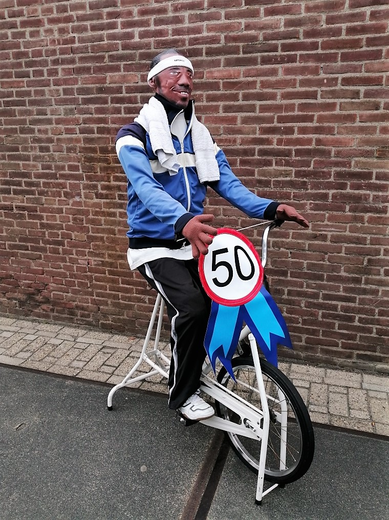 Deze getinte sportieve Abraham gaat "elke" dag naar de sportschool voor een strakke body. Compleet met hometrainer huur je deze Abraham pop.