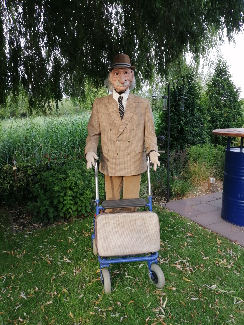Deze Abraham pop wordt met rollator en koffer verhuurd.