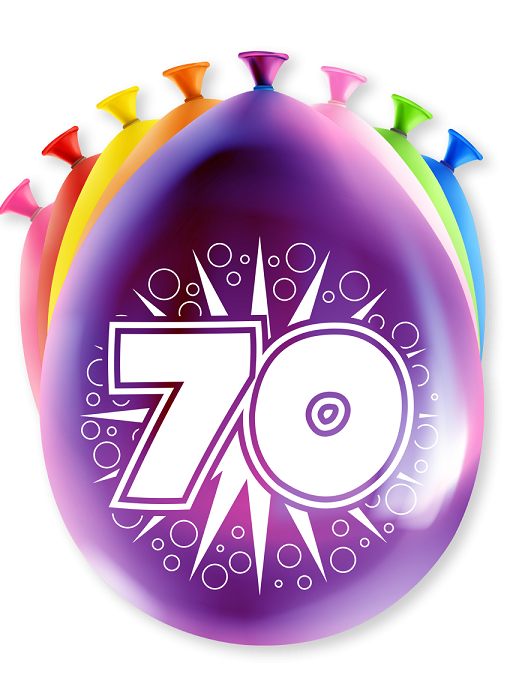 Zak kleurrijke ballonnen met opdruk 70 jaar.